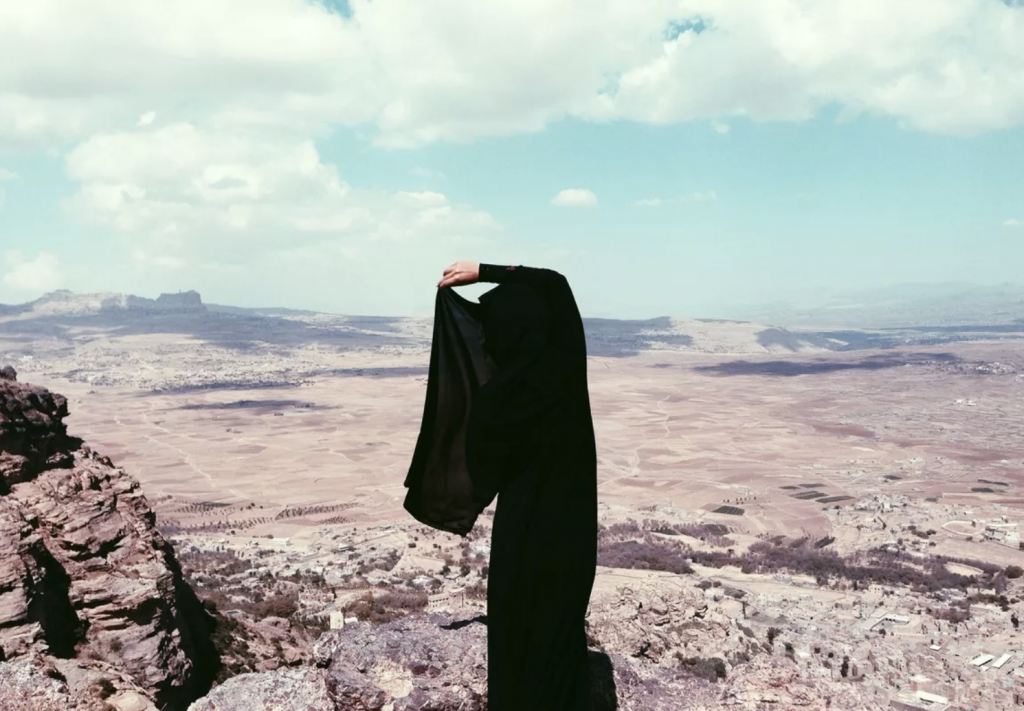 In another photographic series by Yumna Al Arashi titled Northern Yemen. We see untamable landscapes that seem to spread for what feels like eternities, the dry beautiful desert against the vast and dreamish sky, of rich turquoise. Our subject stands in complete contrast to this, completely covered, utterly strong, ‘superheroes or towering statues of immortal and all-powerful goddesses, their hiljabs billowing mightily in the wind.’ Yet there is monumental stillness that overcomes the whole work, you wouldn’t recognize this photograph as Yemen, a war torn nation. The subject is the center of which everything revolves, she grabs our attention, she holds our focus, she is a pillar, something we cling onto, so not to get lost in the oblivion that is living. Yumna aims to present Muslim women as ‘badasses’, she wants to show their incredible depth and shift the stereotype that all Muslim women are oppressed. She is covered but she has total control of her body. Yumna’s subjects have a grace of being that makes one rethink what it means to be a Muslim woman today.